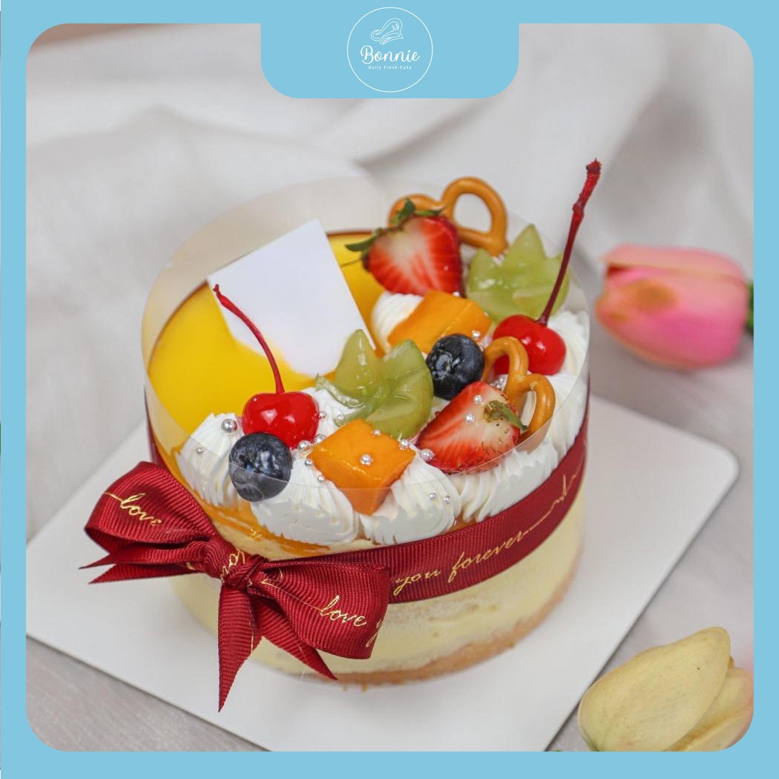 Lớp mousse chanh leo mềm mịn được trang trí bằng trái cây tươi và bánh pretzel giòn tan. Dải ruy băng đỏ với dòng chữ “Love You Forever” khiến chiếc bánh trở thành biểu tượng của tình yêu vĩnh cửu, hoàn hảo cho các cặp đôi.